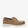 Lady Boat Shoe. WATERPROOF Taupe Nobuck Leather. Lace-up Closure. Leather lining. Removable anatomical insole. Lightweight, flexible and strong EVA rubber sole. Heel height: 4 cm. 100% Made in Spain.