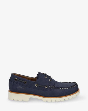 Lady Boat Shoe. WATERPROOF Navy Nobuck Leather. Lace-up Closure. Leather lining. Removable anatomical insole. Lightweight, flexible and strong EVA rubber sole. Heel height: 4 cm. 100% Made in Spain.
