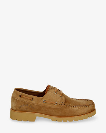 Men's boot shoes. Natural suede. Lace-up Closure. Leather lining. Removable anatomical insole. Lightweight, flexible and strong EVA rubber sole. Heel height: 4 cm. 100% Made in Spain.