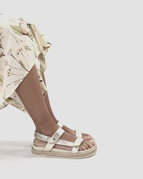Flat woman's sandals. Gold nappa leather. Velcro Closure. Leather lining. Anatomical insole. Flexible and durable Polyurethane sole. Heel height: 4.5 cm. 100% Made in Spain.