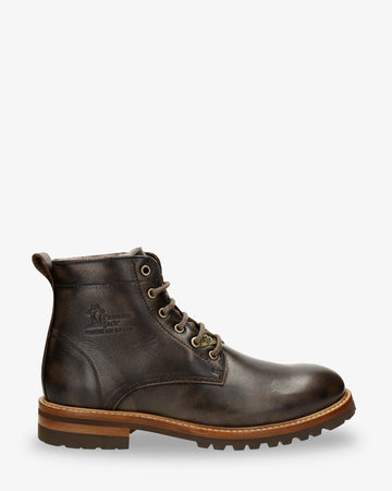 Flat men's ANKLE Boot. Taupe nappa leather. Lace-up Closure. Sheepskin lining. Anatomical insole. Flexible and durable rubber sole. Shaft height: 13 cm. Heel height: 3.8 cm. 100% Made in Spain.