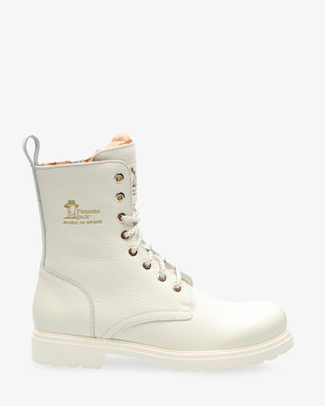 Flat women's Boot. WATERPROOF White Napa Leather. Lace and zipper closure. Warm lining. Removable anatomical insole. Natural, flexible and durable rubber sole. Shaft height: 17 cm. Heel height: 4 cm. 100% Made in Spain.