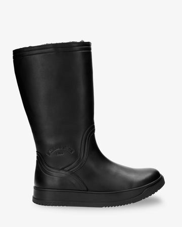 Flat women's Boot. WATERPROOF Black Napa Leather. Warm lining. Removable anatomical insole. Flexible and durable rubber sole. Shaft height: 27 cm. Heel height: 4.3 cm. 100% Made in Spain.