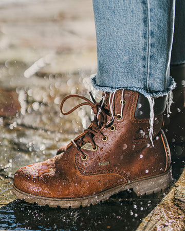 Flat women's Boot. WATERPROOF Tan nappa grass leather. Lace-up Closure. Gore-Tex lining. Removable anatomical insole. Natural, flexible and durable rubber sole. Shaft height: 14 cm. Heel height: 4 cm. 100% Made in Spain.