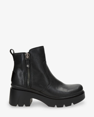 Women's ankle boot with heel. Black nappa grass leather. Zip Closure. Leather lining. Removable anatomical insole. Flexible and durable Polyurethane sole. Shaft height: 13 cm. Heel height: 8 cm. 100% Made in Spain.