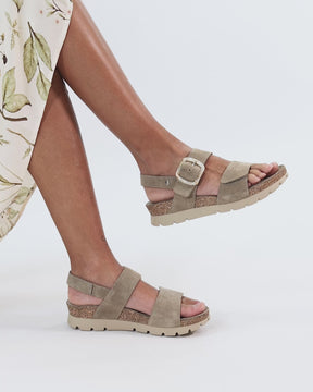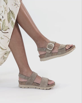 Flat woman's sandals. Taupe suede. Velcro Closure. Leather lining. Anatomical insole. Lightweight, flexible, strong cork and EVA rubber sole. Heel height: 4.5 cm. 100% Made in Spain.