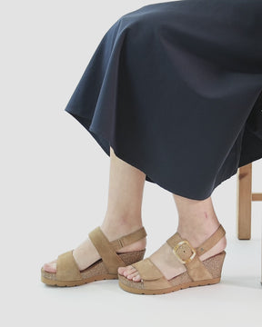 Wedge sandals. Natural suede. Velcro Closure. Leather lining. Anatomical insole. Lightweight, flexible, strong cork and EVA rubber sole. Heel height: 6.5 cm. 100% Made in Spain.
