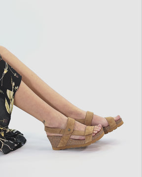 Wedge sandals. Natural suede. Velcro Closure. Leather lining. Anatomical insole. Lightweight, flexible, strong cork and EVA rubber sole. Heel height: 6.5 cm. 100% Made in Spain.