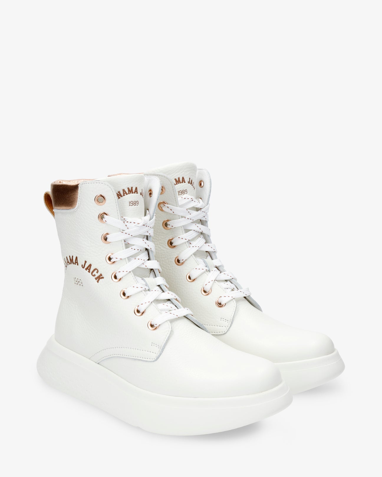 Flat women's Boot. WATERPROOF White Napa Leather. Lace-up Closure. Leather lining. Removable anatomical insole. Lightweight, flexible and strong EVA rubber sole. Shaft height: 15,5 cm. Heel height: 4.7 cm. 100% Made in Spain.