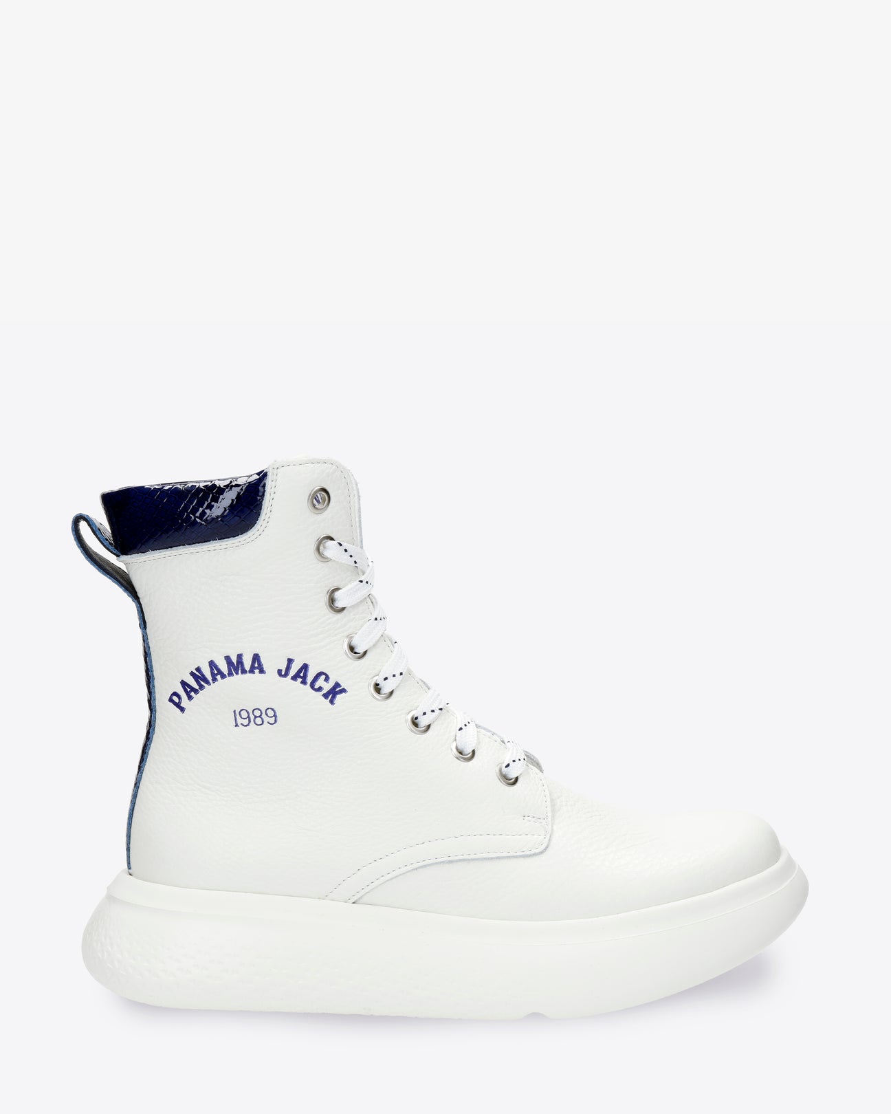 Flat women's Boot. WATERPROOF White Napa Leather. Lace-up Closure. Leather lining. Removable anatomical insole. Lightweight, flexible and strong EVA rubber sole. Shaft height: 15,5 cm. Heel height: 4.7 cm. 100% Made in Spain.